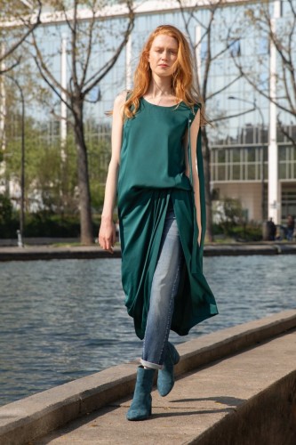緞面長款連衣裙。 無肩帶,左肩飾有鉚釘和緞帶細節。 單穿或穿牛仔褲。 扁平的直形體。
